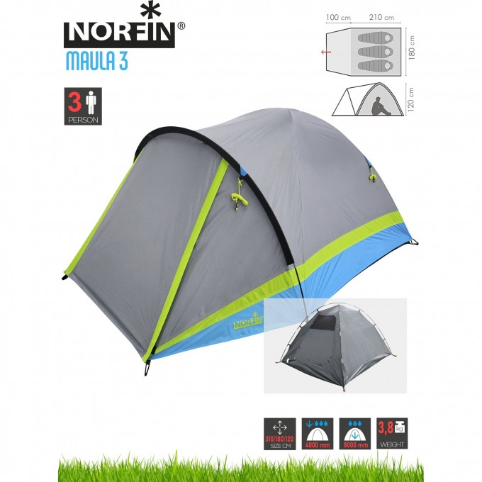 Универсальная двуслойная 3-х местная туристическая палатка Norfin Maula 3 (NFL-10102). Классическая устойчивая конструкция. Сквозная вентиляция спасает в жаркий день. Наличие третьей дуги над входом образует крышу, которая препятствует попаданию дождя внутрь даже при открытой двери тамбура.